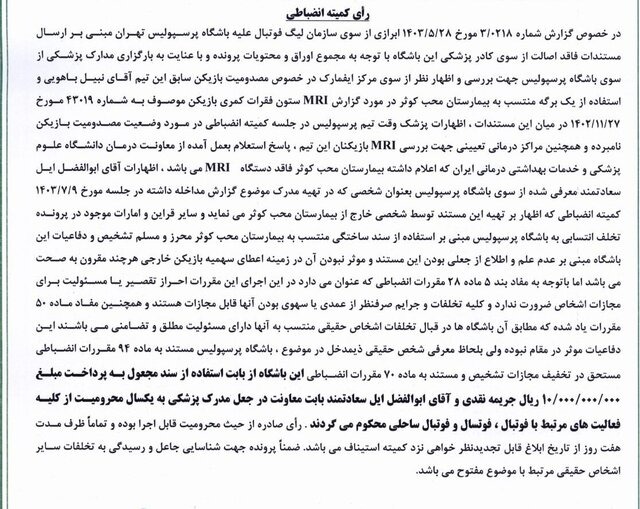 رأی تخلف باشگاه پرسپولیس تهران مبنی بر جعل سند پزشکی به شرح زیر است: